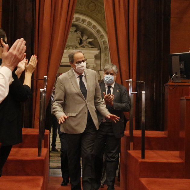 El grup parlamentari de Junts per Catalunya s'ha reunit aquest divendres al matí al Parlament amb Quim Torra per expressar tot el seu suport al president de la Generalitat. Torra ha estat rebut entre els aplaudiments dels diputats de la formació l'endemà de la vista al Suprem, i minuts abans que es reprengués el debat de política general.