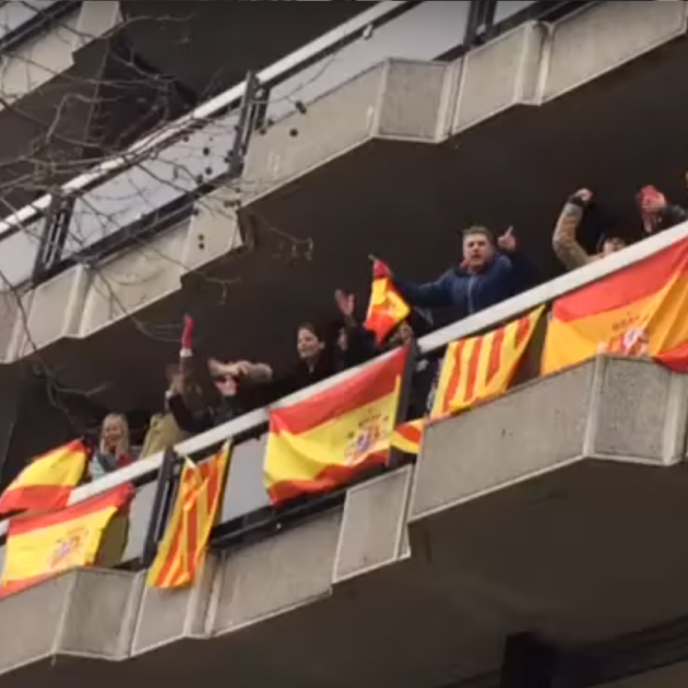 El grup del balcó ha cridat i cantat càntics unionistes al pas de la capçalera, on hi havia Marta Rovira i els vicepresidents d'Òmnium i ANC, entre d'altres. També tenien senyeres i banderes espanyoles penjades, algunes de les quals agitaven en l'aire.