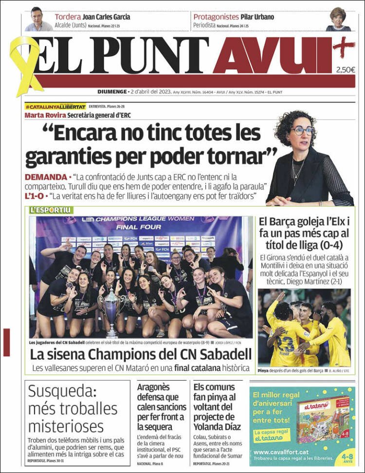 Yolanda Díaz anuncia finalment aquest diumenge la seva candidatura a les eleccions generals per la Plataforma Sumar, en un acte on acudiran una desena de partits de l'esquerra alternativa però en què no hi haurà Podem, que s'ha despenjat de la foto al no aconseguir imposar les seves exigències. L'acte, que es preveu multitudinari, se celebrarà a partir de les 11.30 hores al poliesportiu Magariños de Madrid, on ja han confirmat la seva assistència dirigents de primera fila d'Izquierda Unida, Més País, els comuns, Compromís, la Chunta aragonesista, Batzarre, Drago, Verdes Equo, Moviment per la Dignitat i la Ciutadania de Ceuta o el Partit Verd Europeu. El País titula: "Díaz assumeix el lideratge de Sumar amb Podemos absent". Podemos condicionava la seva assistència a tenir abans tancat un acord per escrit perquè tots els candidats a les generals s'elegissin per primàries obertes, però la vicepresidenta segona el que els ha ofert és un compromís que hi hauria primàries, encara que la fórmula concreta seria consensuada més endavant per totes les forces que se sumin al projecte. La fotografia és per al papa Francesc, que aquest dissabte va sortir de l'hospital.