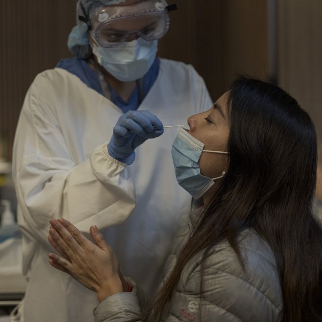 Imatge principal: Una infermera fa una prova PCR a una pacient a l'Hospital de Sant Pau (Barcelona) / Sergi Alcàzar