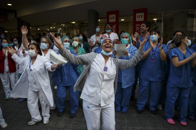 Aplaudiments del personal sanitari a la porta d'urgències de l'Hospital de Sant Pau de Barcelona. / Foto: Sergi Alcàzar