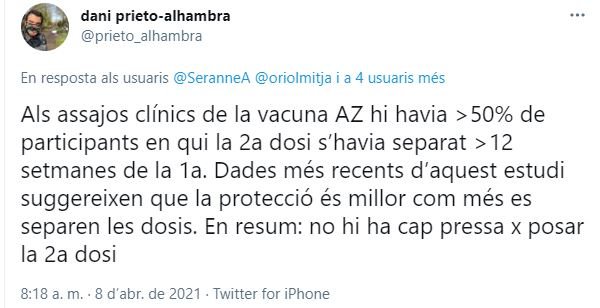 En aquest sentit, el catedràtic de farmacoepidemiologia de la Universitat d'Oxford, Daniel Prieto Alhambra, ha assegurat que no hi ha pressa per vacunar-se amb la segona dosi. Segons Prieto Alhambra, els assajos clínics de l’AstraZeneca demostren que “la protecció és millor com més se separen les dosis. En resum: no hi ha cap pressa per posar la segona dosi”.
