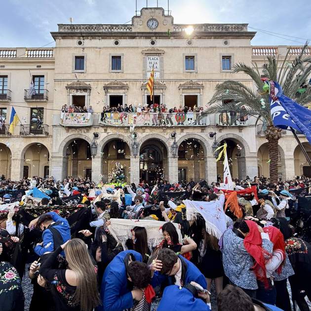 La data més esperada al calendari dels vilanovins s'ha pogut celebrar amb normalitat aquest diumenge després que el temporal de vent hagi deixat afectacions en actes de Carnaval arreu de Catalunya per les alertes aquest cap de setmana. A Vilanova i la Geltrú, unes 11.000 parelles han protagonitzat un Diumenge de Comparses amb rècord de participants, que han omplert la plaça de la Vila de caramels amb set guerres dolces entre les 9.119 parelles adultes registrades, una de juvenil i quatre més d'infantils. La d'aquest diumenge és una de les cites destacades del Carnaval de Vilanova, que va arrencar dijous amb la Merengada i va seguir divendres amb l'Arrivo, que enguany ha commemorat el mig segle de la seva recuperació. Tots dos actes es van veure afectats per vent i pluja, que van obligar a endarrerir unes hores l'arrencada. "Tot s'ha pogut reconduir, dijous, fruit de l'alerta per vent, vam adequar horaris, la resta ha funcionat amb més o menys normalitat, i aquest diumenge ha fet un temps espectacular", ha destacat l'alcalde de la ciutat, Juan Luis Ruiz.