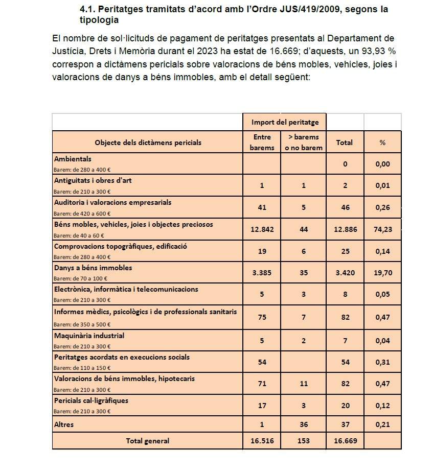 El Departament de Justícia va gastar 950.812 euros en el pagament de peritatges judicials l’any 2023, segons consta a la seva memòria. En total, es van fer 31.802 peritatges judicials, un 12% més que el 2022. La majoria són dictàmens pericials sobre valoracions de béns mobles, vehicles, joies i valoracions de danys a béns immobles.