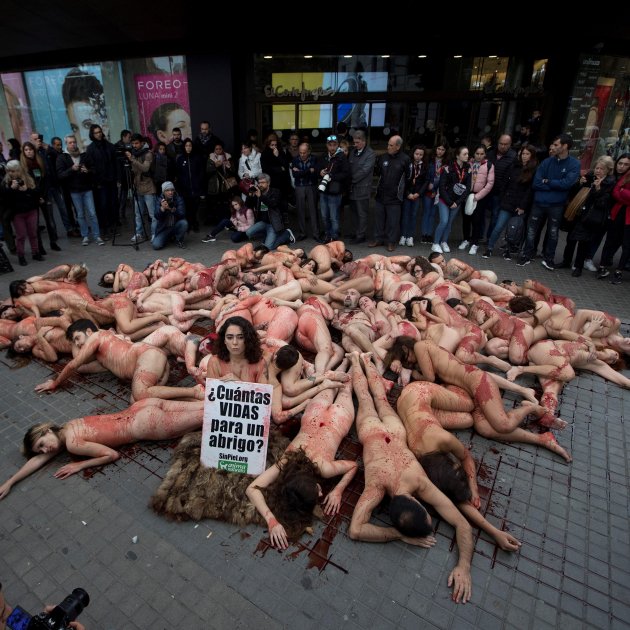 Una cinquantena d'activistes animalistes s'han manifestat avui nus i amb el cos cobert de sang artificial a la plaça Cataluña de Barcelona, per protestar contra la indústria pelletera i en defensa dels animals. Els manifestants s'han tombat a terra amuntegats uns a sobre els altres, imitant com queden els cossos dels animals sense vida una vegada que els han arrencat la pell, segons ha informat Animal Naturis.
