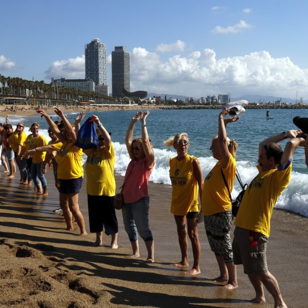Uns 250 veïns de la Barceloneta, vestits amb samarretes grogues, s'han concentrat aquest dissabte a la platja davant el Restaurant Salamanca per protestar contra el model turístic de Barcelona. Sota el lema "Cap més estiu com aquest" i amb l'objectiu de denunciar la pèrdua dels espais públics i exigir-ne la recuperació, els veïns han format una cadena humana davant de l'aigua.