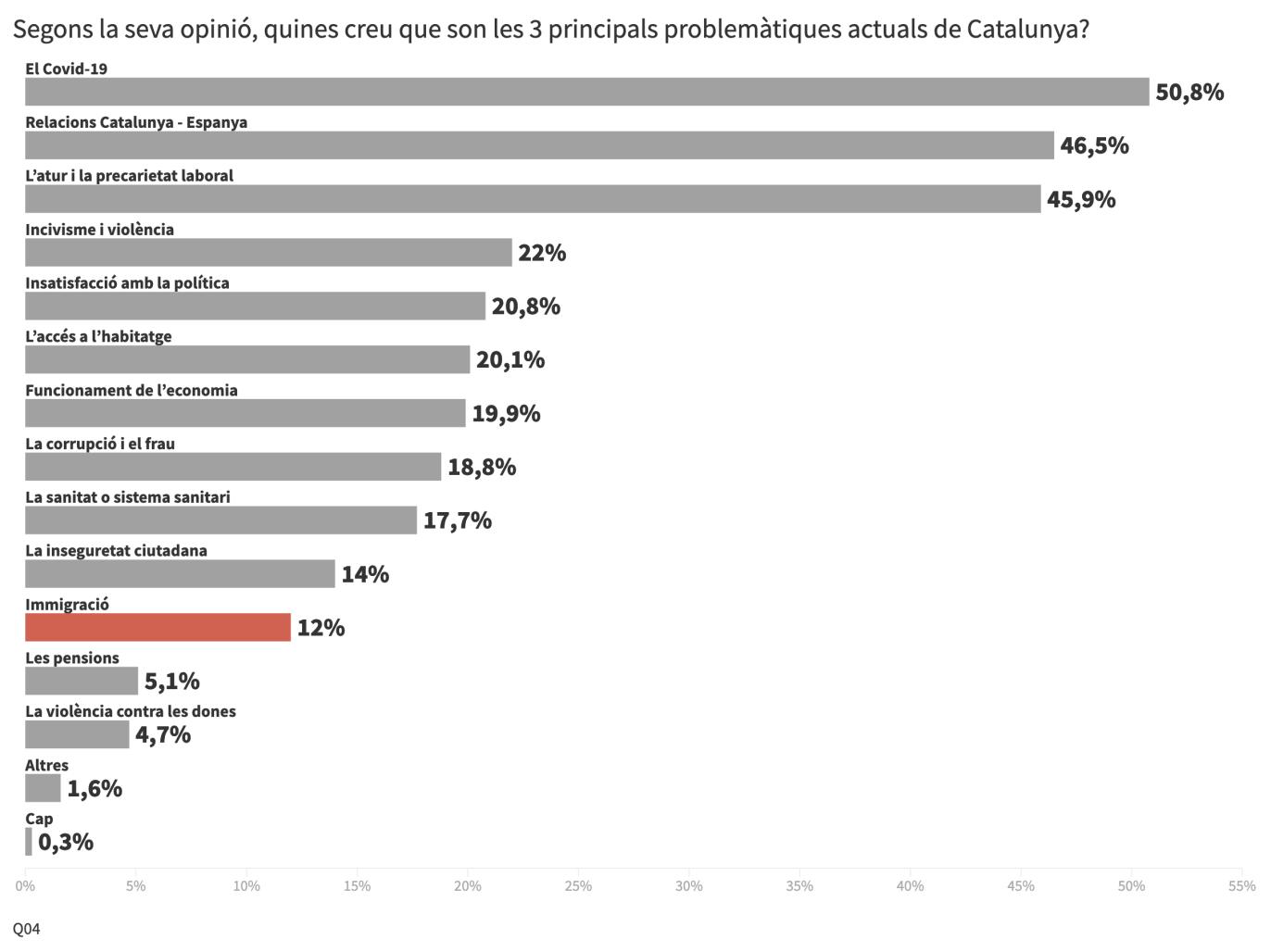 Tal com recull l'estudi, que s'ha elaborat a partir d'un qüestionari repartit entre la població general major d'edat i resident a Catalunya en els últims 5 anys, la percepció mitjana és que hi ha un 29,3% de persones immigrants, quan la dada real és el 16,2%. Tot i això, només el 12% dels enquestats creu que la immigració és un problema a resoldre. De fet, aquesta preocupació ocupa el lloc número 11 en la llista, i les principals problemàtiques són la pandèmia (50,8%), les relacions entre Catalunya i l'Estat (46,5%) i l'atur i la precarietat laboral (45,9%).