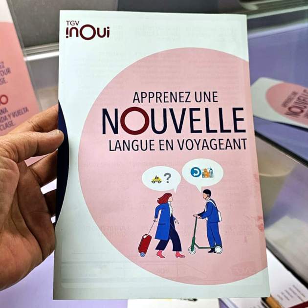 L'SNCF, la companyia nacional ferroviària de França, ofereix classes de català gratuïtes durant els viatges amb TGV —l'alta velocitat— entre París i Barcelona. Són professors de l'Institut Ramon Llull els encarregats d'ensenyar paraules, expressions i nocions de cultura catalana als passatgers francesos que venen a Barcelona. Ho fan en classes d'uns quinze minuts al vagó bar, que s'anuncien per megafonia. També reparteixen cartells i materials didàctics pel tren. Des d'aquest estiu han començat amb una prova pilot i oferiran una vintena de sessions fins a acabar aquest 2025. La previsió és ampliar i consolidar el servei a partir del 2026 per poder oferir lliçons de català "cada dia, en tots els trens".