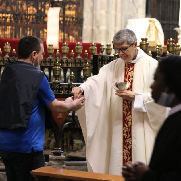 La primera missa a la catedral de Barcelona després de dos mesos ha estat la de les nou del matí d'aquest dilluns. L'ha oficiat el canonge Santiago Bueno i ha congregat una desena de persones que han arribat amb mascareta, s'han rentat les mans amb gel desinfectant i s'han situat als bancs respectant les indicacions.