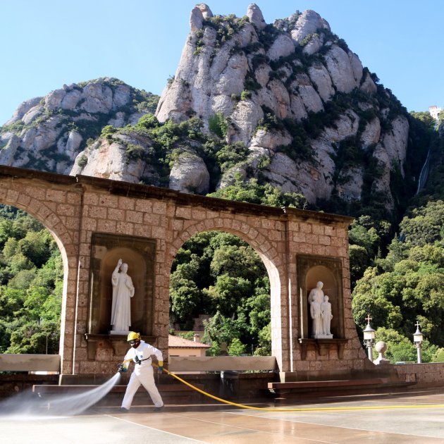 El Monestir de Montserrat va tancar les portes el 13 de març amb l'estat d'alarma per la Covid-19 i no preveu obrir-les de nou fins que Barcelona entri en la fase 2 de desescalada. Mentrestant, però, s'està fent una neteja i desinfecció setmanal de les zones de pas del recinte i mobiliari urbà com a mesura preventiva. Uns treballs que estan duent a terme efectius d'Agents Rurals i del Grup Especial de Prevenció d'incendis Forestals (Forestal Catalana) i que han encarregat des de la mateixa abadia.