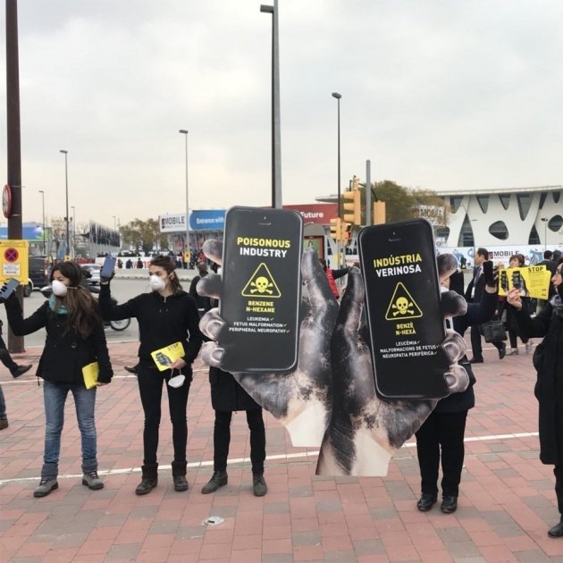 Un grup d'activistes de Setem Catalunya ha alertat en una protesta en la inauguració del Mobile World Congress (MWC) que grans empreses fabricants de mòbils com Apple i Samsung utilitzen productes químics tòxics a la seva producció, el que comporta "l'enverinament de treballadors", que en alguns casos pateixen càncer i danys en el sistema nerviós, han assegurat.