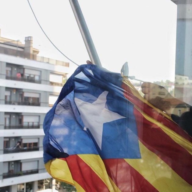 Després d'una estona han aconseguit accedir al pis corresponent. Al lloc on hi havia penjada la bandera espanyola, hi han posat una estelada.
