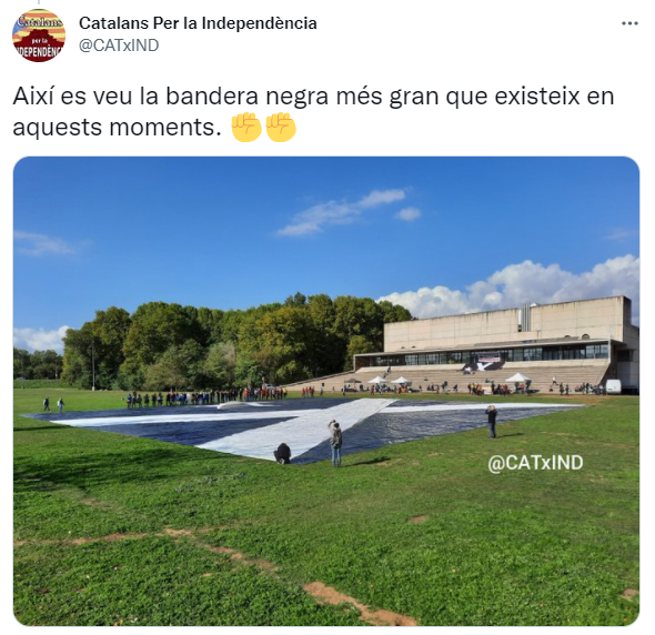 Es tracta d'una bandera negra independentista amb unes dimensions de 60 per 40 metres, que entre les 11 i les 12 hores s'ha desplegat per parts davant del pavelló municipal Girona-Fontajau, a la llera del riu Ter. Després del desplegament, representants de 21 Raons —que reuneix encausats per l'1-O a Girona— han fet parlaments. Els Sanitaris per la República també han acudit a l'acte.