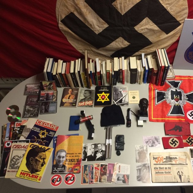 La policia va realitzar una entrada i perquisició al domicili del detingut a Barcelona. A l'interior del pis es va intervenir una pistola elèctrica i un esprai d'autodefensa, així com nombrós material amb simbologia nazi. Concretament, es va trobar una bandera, braçalets, postals, fotografies, llibres i diversos manuscrits, entre altres objectes. El detingut, acusat de delictes contra la salut pública i de tinença il·lícita d’armes, està en llibertat amb càrrecs després de passar dissabte passat a disposició judicial.