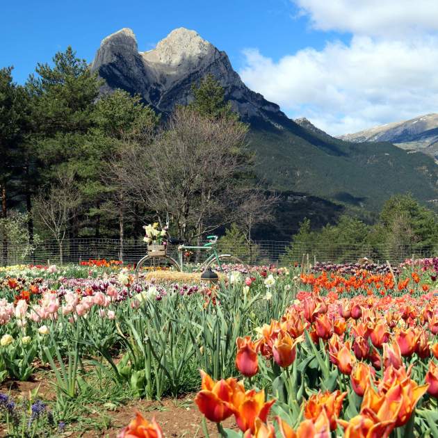 El Berguedà no són els Països Baixos, però aquests dies ho sembla. El petit Keukenhof català promociona en la seva web l’empresa Tulipmania, propietat de Seila Malo, una plantació amb més de 350 varietats de tulipes, que el mes d’abril, durant la floració, es converteix en un esclat de colors que són èxtasi per als sentits. Per qui no ho sàpiga, Kenkenhof és un extens parc de més de 32 hectàrees amb un immens jardí de tulipes, situat entre les localitats de Lisse i Hillegom, als Països Baixos, conegut com “el jardí d’Europa”, i considerat un dels indrets més bonics del país. Tulipmania està ubicat a Saldes, als peus del Pedraforca, a més de mil metres d'altitud, i ha provocat una bogeria per les tulipes que s’ha convertit en un fenomen turístic. L’empresa va començar l'activitat amb les tulipes en una altra plantació a Coforb, al terme municipal de Capolat, on en el 2019 va emprendre un projecte pilot amb el cultiu de 15.000 tulipes de 24 tipologies diferents, però al 2023 es van traslladar a Saldes. Són unes setmanes “tant curtes com intenses”, però que permeten als visitants gaudir “d’un dels paisatges més màgics, bonics i emblemàtics de Catalunya”, reconeix Seila Malo, una fotògrafa establerta a Holanda, país al qual va anar a estudiar i treballar, concretament com a guia de flors, i va decidir "portar a Catalunya el concepte de show garden/pick up i tot aquest coneixement".