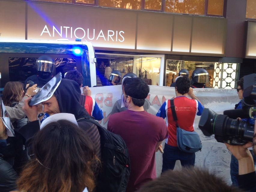 Al marxar, però, els Mossos han hagut d'encapsular la manifestació i protegir les botigues de la part alta de Passeig de Gràcia perquè alguns dels concentrats hi han anat fent pintades. "Pijos" han escrit en alguns aparadors, sortint de la seva reivindicació per recuperar el Banc Expropiat.