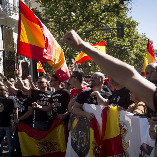 Mentrestant, fora el carrer ressonen els crits i les botzines. Milers de policies reclamen l'equiparació salarial amb els Mossos. Diuen que fa dies que havien convocat la manifestació, però coincideix el mateix dia de la declaració dels presidents d'Òmnium Cultural i l'ANC per sedició a l'Audiència Nacional. La concentració és al carrer Génova, just al davant. I els manifestants engeguen proclames entre les quals hi ha consignes contra el major dels Mossos, Josep Lluís Trapero, que un parell d'hores abans era dins l'edifici declarant i donant tots els detalls del dispositiu.