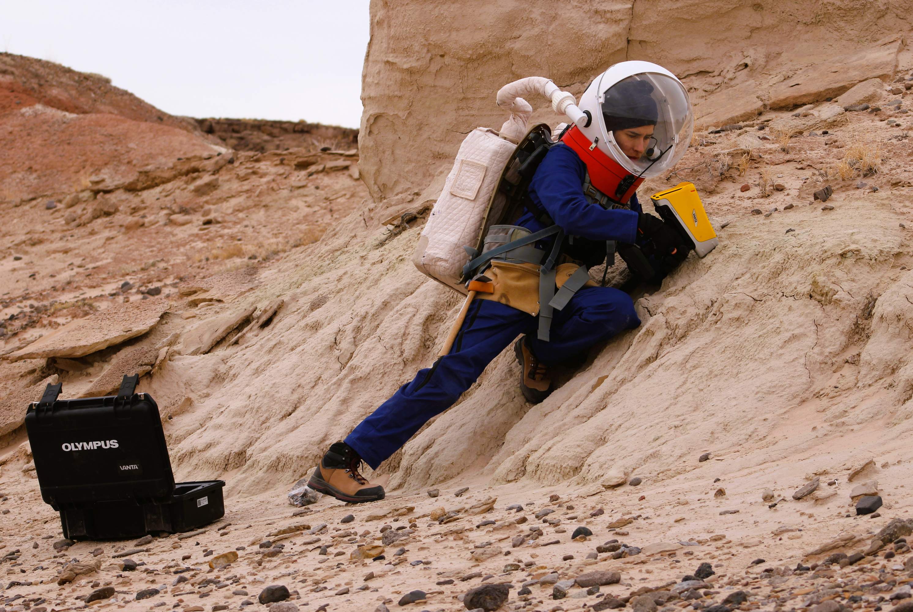 Imatge principal: una de les tripulants de l'Hypatia II fa un experiment geològic en el desert de Utah / Hypatia Mars