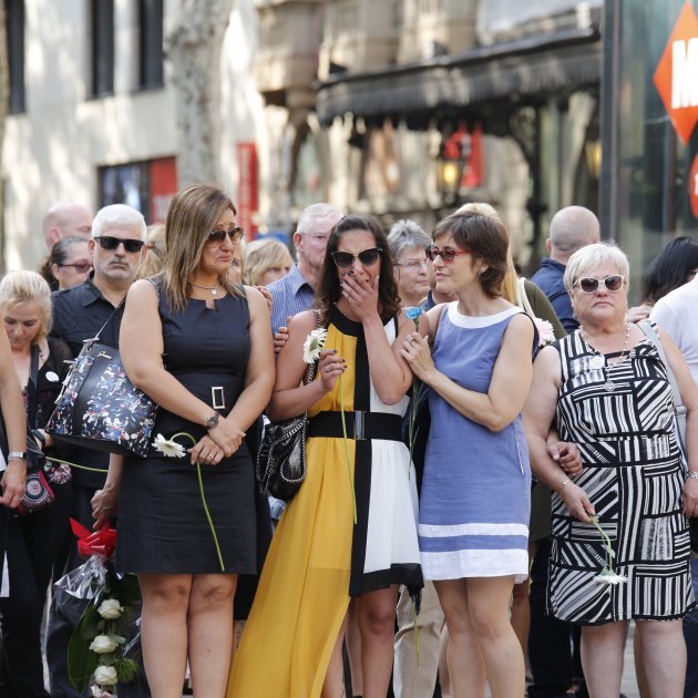 Els familiars de les víctimes mortals dels atemptats de Barcelona i Cambrils del passat 17 d'agost han realitzat una austera ofrena floral al mosaic de Joan Miró de la Rambla, lloc on va acabar la furgoneta. Entre els aplaudiments espontanis de la ciutadania, els familiars, visiblement afectats, han dipositat flors en cinc jardineres preparades per l'ocasió.