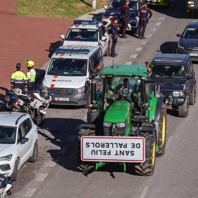Imatge principal: un tractor amb un cartell cap per avall de Sant Feliu de Pallerols (Garrotxa) arriba a l'entrada de Barcelona / ACN
