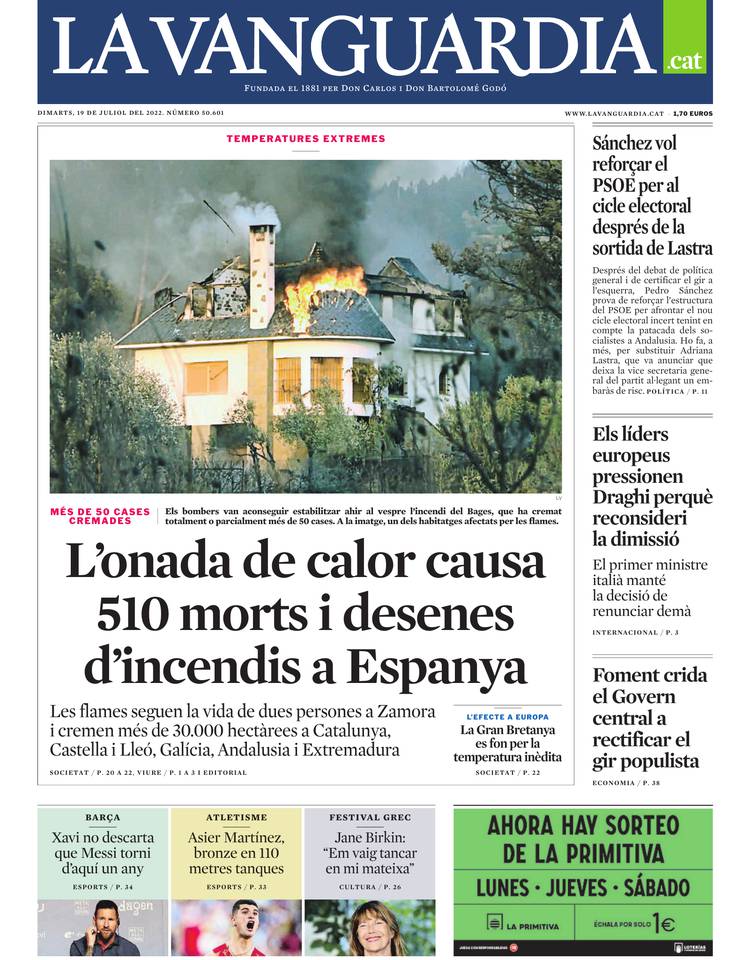 L’onada d'incendis que s'acarnissa amb Catalunya, Espanya, Portugal, França, Itàlia, Grècia, Croàcia i altres països del sud d’Europa són el que els tècnics anomenen incendis de cinquena generació: grans focs simultanis que superen les capacitats dels sistemes d’extinció. Víctor Resco de Dios, professor d'enginyeria forestal i canvi global a la Universitat de Lleida, explica a The Conversation els tres factors diferencials dels sinistres d’aquest any. El primer, els incendis s’avancen i n'hi ha més fora de l’estació habitual. La segona, l’alta intensitat: ja no es poden extingir i moren quan han cremat tot el que podien cremar o perquè plou. La tercera, la simultaneïtat d’aquests incendis tan intensos. Els “focs en paral·lel” dels que parla El Punt Avui, l’únic diari que aquest dimarts situa els incendis d’aquí en el context continental i de canvi climàtic. Resco avisa que “ara veiem el resultat de dècades de deixadesa en la gestió del territori i d'inacció climàtica”. Ja fa dos dies que les portades dels diaris de paper van carregades amb aquestes calamitats.