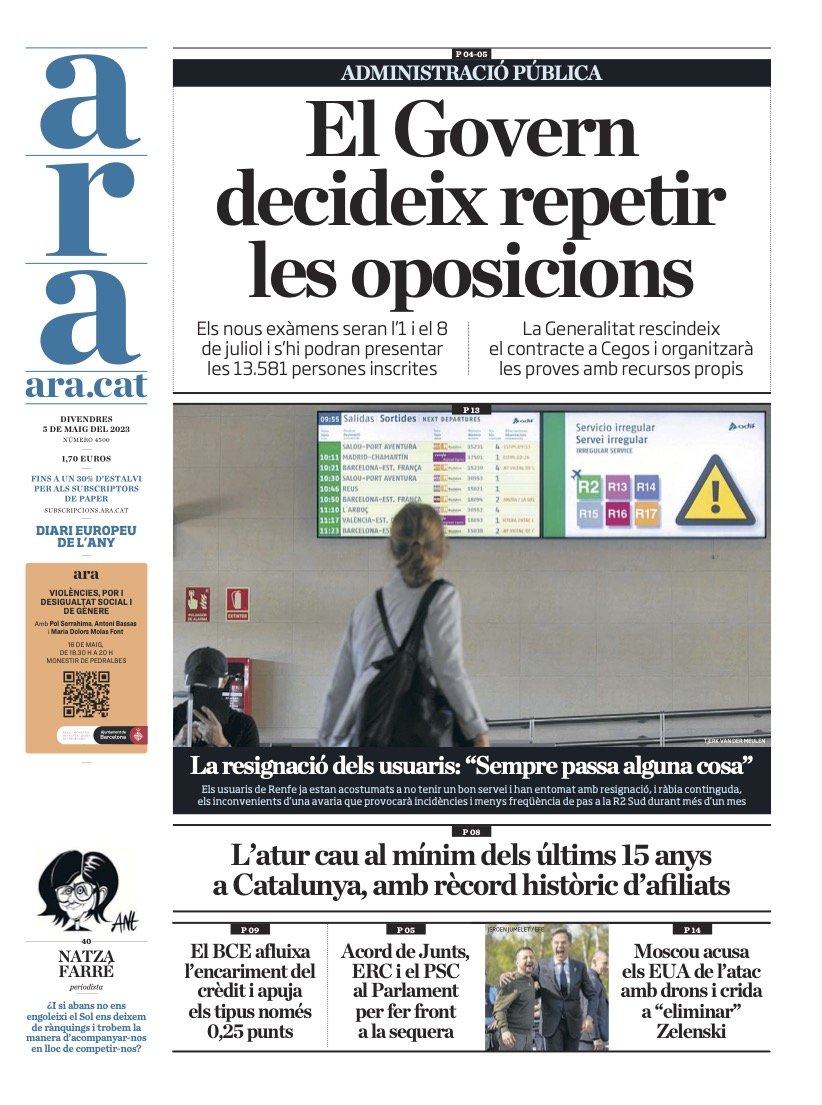 L’Ara també manté el tema en portada, ni que sigui amb menys substància noticiosa. Hi afegeix als usuaris del servei, els que pateixen de debò els desoris que la ministra prova d’amagar. “Sempre passa alguna cosa”, comenta resignat el viatger que ha fet el títol. La Vanguardia és l’únic diari que no en diu res en portada. Dijous ho tenia petitet al fons de la portada i descrit com “una picabaralla política”. Aquest divendres tot mor en un faldó a la pàgina 28 on s’explica que els autobusos alternatius “alleugen el col·lapse”, com qui tracta d'una anècdota. L'R2 Sud o línia del Garraf no és qualsevol via. És una de les més freqüentades: 134.000 usuaris en dies feiners, 261 trens diaris. Connecta 34 estacions entre la de França, a Barcelona, i la de Sant Vicenç de Calders via El Prat, Gavà (d’on és la mateixa ministra), Castelldefels i Vilanova i la Geltrú.