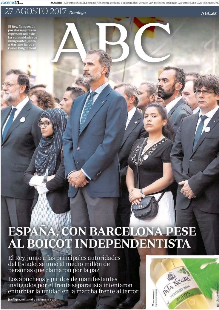 Finalment, ABC obre amb un primer pla de Rajoy, el Rei i Puigdemont. "Espanya, amb Barcelona malgrat el boicot independentista", titula el rotatiu conservador, que afirma que "les escridassades i xiulades de manifestants instigats pel front separatista van intentar enterbolir la unitat en la marxa enfront del terror".