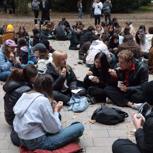 El primer Pudding mit Gabel es va celebrar a finals d’agost a Karlsruhe, una ciutat tranquil·la del sud-oest d’Alemanya coneguda sobretot per ser la seu del Tribunal Suprem. Tot va començar amb una fotocòpia penjada a l’aparador d’un comerç local que animava els veïns a portar-se un púding i una forquilla a la plaça Kronenplatz. La idea, tan absurda com irresistible, es va escampar com la pólvora. En poques setmanes, es van organitzar trobades similars a Stuttgart, Hamburg, Múnic, Hannover i desenes d’altres localitats. Les reunions sempre comencen amb calma, amb grups de joves —la majoria al voltant dels 20 anys— compartint forquilles i converses en rotllanes reduïdes. Però a mesura que passen les hores, l’ambient canvia. S’hi posa música, apareixen cerveses, alguns encenen cigarrets i el que era una quedada absurda es transforma en una festa improvisada.