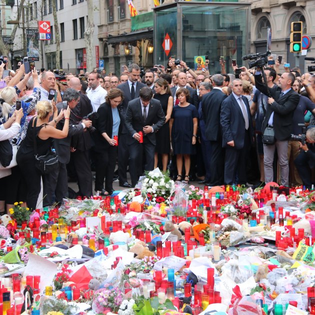 El rei Felip VI, el president Carles Puigdemont i l'alcaldessa de Barcelona, Ada Colau, han compartit aquest dissabte una ofrena a la Rambla de Barcelona, el lloc de l'atemptat de dijous.