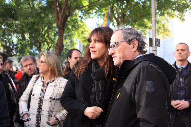Español ha rebut el suport de més d'un centenar de persones que s'han concentrat des de dos quarts de deu del matí a les portes de la Ciutat de la Justícia. Entre els presents hi havia el president Quim Torra i la consellera Laura Borràs i altres personalitats com el portaveu d'ERC al Congrés, Joan Tardà, o el diputat de la CUP Carles Riera.