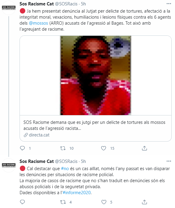 SOS Racisme també afirma que quan el jove va intentar fugir, un dels policies va disparar i, també segons l'escrit d'acusació, més tard va dir: "He fallat, eh? Que si no, et rebentava les costelles amb la bala. Has sentit la bala quan t'he disparat?". L'entitat antiracista va fer públic el cas el juny del 2020 ocorregut el gener del 2019, quan el denunciant va ser detingut i "presumptament se'l va humiliar i agredir".