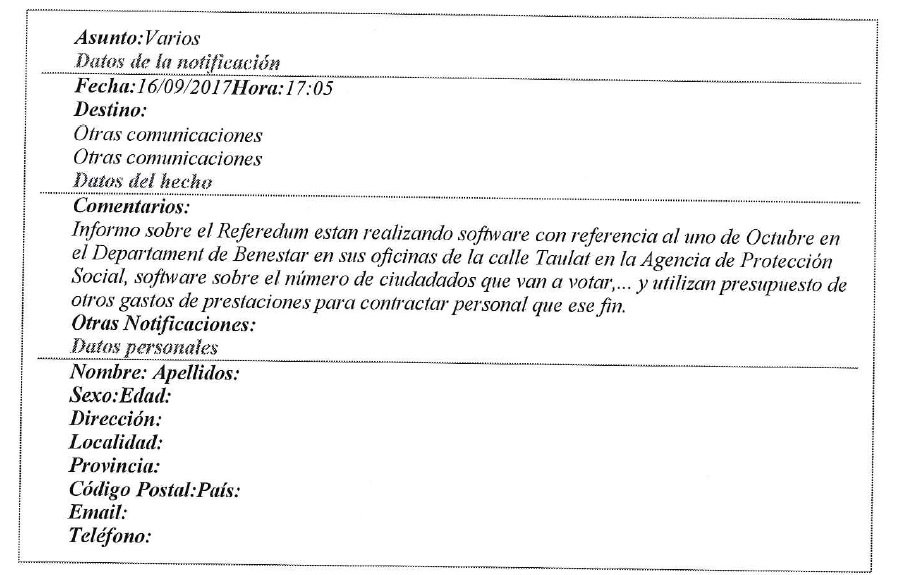 L'altre anònim arriba el 16 de setembre. És més curt, sense detalls i s'envia a la policia via l'adreça de correu electrònic de participació ciutadana. És més un anònim/denúncia que alerta que s'està destinant part del pressupost de Benestar Social a les necessitats informàtiques del procés.
