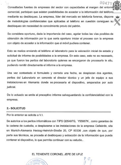 La Guàrdia Civil acaba demanant autorització al jutge per traslladar el mòbil al Grup de Delinqüència Econòmica i Tecnològica i si, tot i així, aquesta unitat tampoc pot desencriptar la informació, demana permís per portar el mòbil fins a Madrid perquè se n'encarregui l'Àrea Electrònica del SECRIM, el servei de criminalística de la Guàrdia Civil.