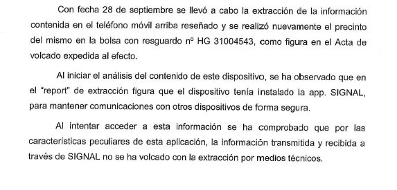 Hi ha un altre mòbil que ha portat mal de caps als investigadors. És l'aparell de Joan Manuel Gómez, cap de riscos del CESICAT. La Guàrdia Civil encara no ha pogut obrir l'aplicació SIGNAL i extreure'n tots els missatges.