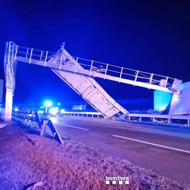 Treballem 5 dotacions #bomberscat en l'accident de l'A-2 a Vilagrassa (avís 18.52h). Un camió ha topat amb un pilar d'una infraestructura metàl·lica de senyalització i ha cedit a sobre la via. Estem fent l'excarceració del conductor del camió. https://t.co/MDRRVpucz7 pic.twitter.com/z3GIvPbizG