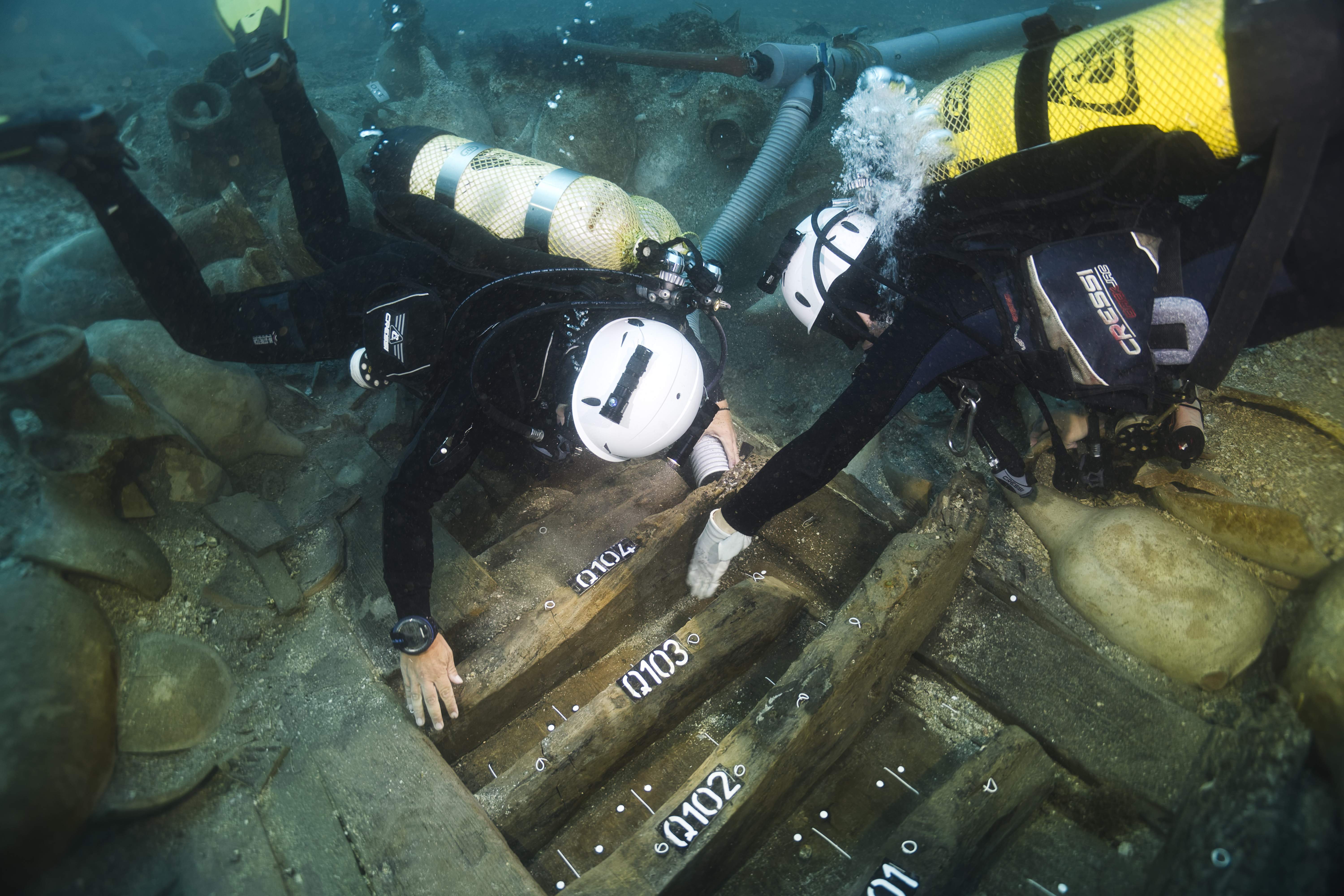 Durant l'última campanya, els arqueòlegs s'han centrat a explorar la popa del vaixell i han resseguit la zona de babord (la banda esquerra). Després d'extreure les àmfores estibades a la bodega (34 de senceres), han pogut accedir a la fusta del vaixell i han localitzat tres fustes amb inscripcions úniques, entre les taules del pallol (les que recobrien el buc). "Són marques pintades que semblen que corresponen a numerals romans", precisa Geli, que afegeix que són "inèdites, que no s'han trobat en cap altre vaixell d'època antiga al Mediterrani".