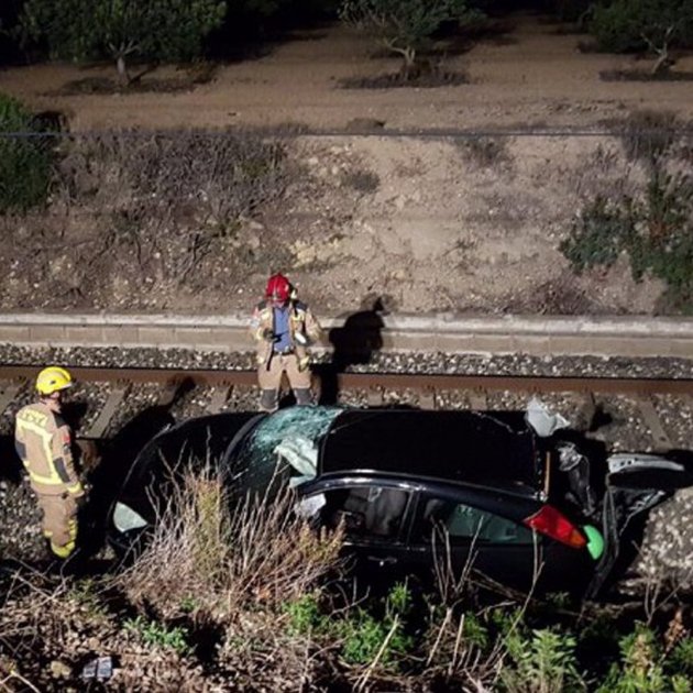 Els fets s'han esdevingut cap a les 11 de la nit quan, per causes desconegudes, el vehicle, que estava estacionat al pàrquing d’un centre comercial del carrer Batlle Pere Molas, ha caigut per un desnivell de sis metres d’alçada. El turisme —un Ford Focus— ha acabat a la via del tren, per on ha passat un comboi de llarga distància cap a les 23.08 hores que ha arrencat la xapa lateral del cotxe. Per sort, el conductor només ha resultat ferit lleu.