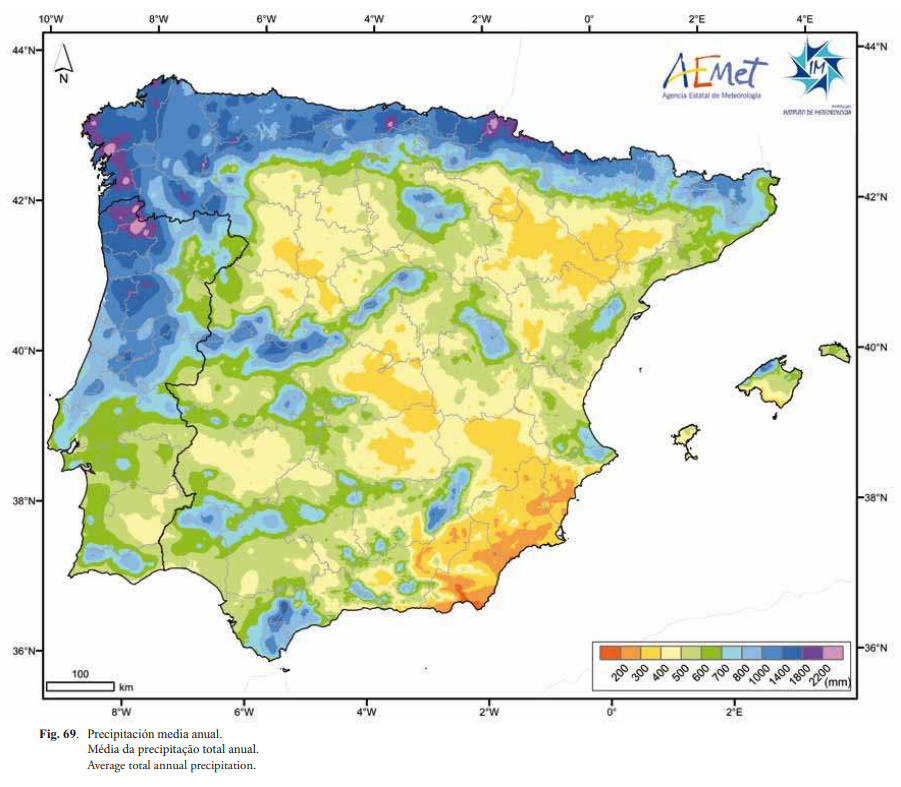 En l'anterior mapa, es pot veure per un costat la precipitació mitjana anual per al període 1961-2000, estimada a partir del model multivariant obtingut amb les dades de 132 estacions de l'AEMET (mapa de l'esquerre), i per l'altre, la precipitació mitjana anual estimada a partir d'un ajustament topogràfic de 116 estacions de l'AEMET disponibles fins al 1990, segons Ortubai (1995).