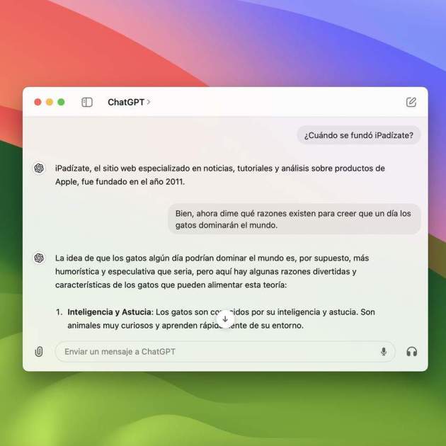 ChatGPT per a Mac permet sol·licitar tota mena de qüestions sobre informació a la xarxa, correus electrònics, captures de pantalla i continguts del Mac. Fins i tot s'ha implementat un mode de veu per tenir converses parlades amb la intel·ligència artificial de ChatGPT.