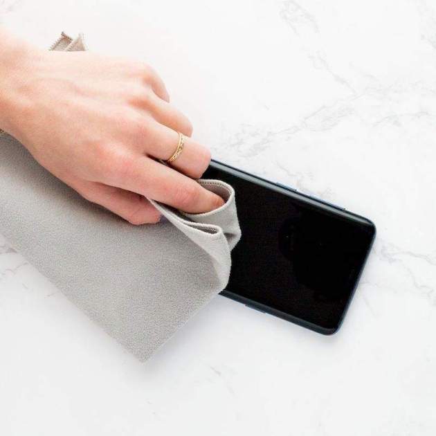Usuari netejant el seu iPhone.