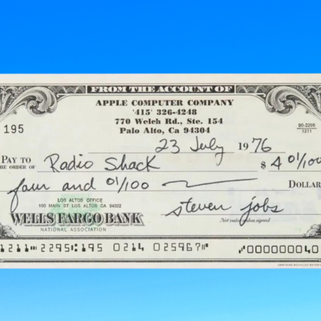 Els objectes signats per Jobs són bastant escassos i això sempre fa que qualsevol novetat mantingui els seguidors de la firma i del seu fundador a l'expectativa. El més recent d'aquests, és un xec signat per Steve Jobs a nom del llavors líder en electrònica RadioShack. Però això no és tot: aquest xec té una connexió amb la història de l'origen de la primera associació de Steve Jobs i Steve Wozniak abans d'Apple.