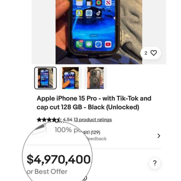 Tal com es pot veure en aquesta publicació de X, un iPhone 15 Pro amb TikTok i CapCut instal·lats s'ofereix a eBay per un preu de 4.970.400 dòlars. Compraries un iPhone només per tenir aquestes apps instal·lades? És una bogeria completa ja que només amb visitar el lloc popular de vendes pots comprovar que hi ha altres usuaris que et venen diferents iPhone 15 amb TikTok. Els preus van des dels 2.000 euros fins a xifres de 45.000 euros.