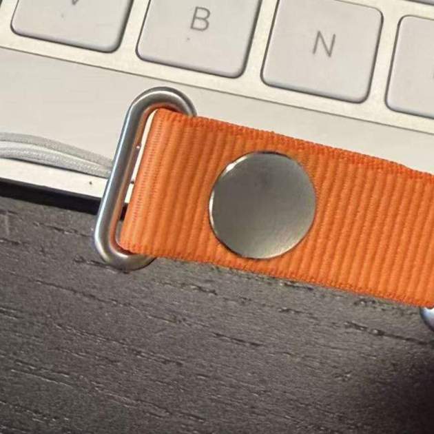 És probable que tinguem disponible aquesta corretja en diferents teixits, materials i colors. En aquest cas, és d'un color taronja molt cridaner, que aniria a joc amb el color taronja que també tindran els iPhone 17 Pro. Podem veure que és una corretja bastant llarga i que tindrà un disseny similar a les de l'Apple Watch.