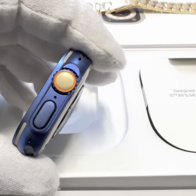 La carcassa de titani de l'Apple Watch Ultra ha passat a ser de color blau, juntament amb el botó d'acció, mentre que s'ha volgut conservar el to ataronjat de l'anell de la Corona Digital.