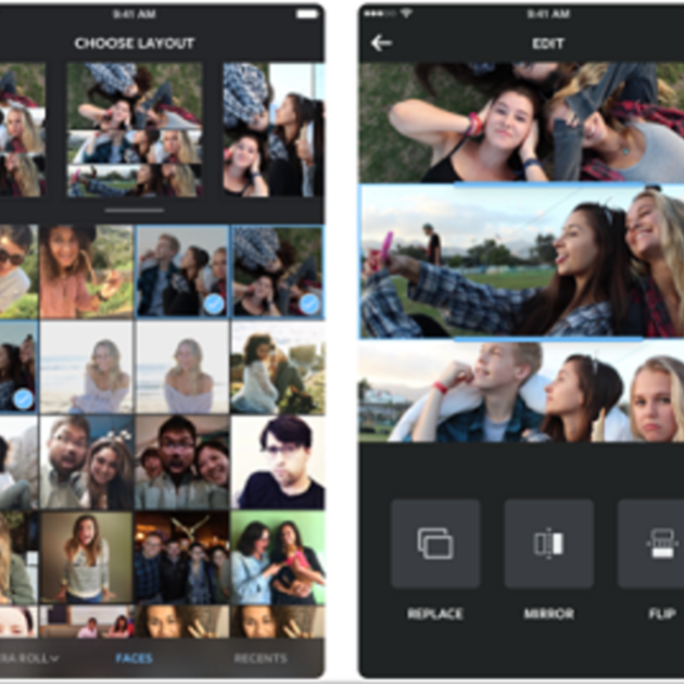 Disseny: És una aplicació que ofereix Instagram i que es caracteritza per tenir plantilles senzilles, amb opcions per canviar la mida de les imatges, reorganitzar o reflectir fotos. És ideal per a usuaris que només vulguin muntar una presentació senzilla d'imatges, prèviament editades, ja que l'app no ofereix aquest tipus d'opcions que ja estan a Instagram.