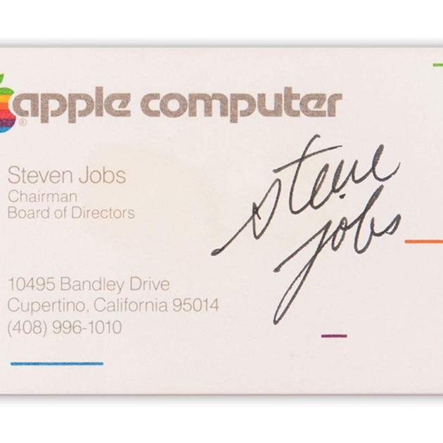 Una rara targeta de visita d'Apple Computer de 1983 signada per Steve Jobs s'acaba de vendre per 181.183 dòlars en una subhasta, segons la casa de subhastes RR Auction de Boston. Es tracta d'una targeta en molt bon estat de conservació, amb el clàssic boig arc de Sant Martí d'Apple i l'antiga adreça de la seu de la companyia a Cupertino. A la zona dreta tenim l'autògraf de Steve Jobs.