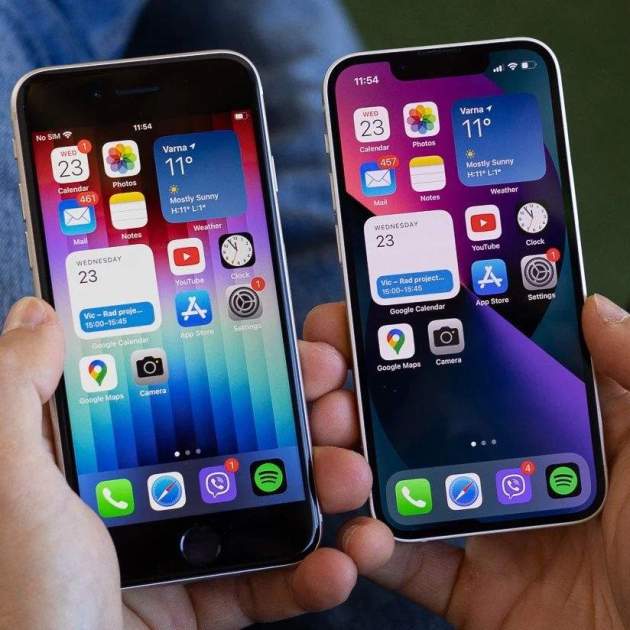 A grans trets, la mida de l'iPhone SE i la de l'iPhone 12 mini o l'iPhone 13 mini és molt similar. No obstant això, hi ha dues diferències crucials: la pantalla de tipus OLED (no LCD) ocupa tot el frontal i compta amb Face ID gràcies al notch de la part superior. En canvi, l'iPhone SE té uns grans marcs en els quals incorpora el botó d'inici amb Touch ID o l'altaveu frontal.