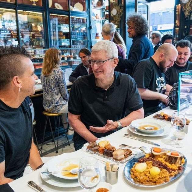 Poc després, Tim Cook va estar menjant a Casa Lhardy, un dels restaurants més emblemàtics de la capital, juntament amb Dabiz de DiverXO mentre li explicava com usa el nou iPhone 15 Pro Max per intentar millorar les seves habilitats culinàries. Pel que sembla, Tim va tastar el cocido madrileño i li va agradar molt!