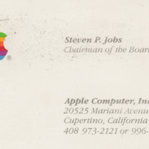 "Targeta de presentació original d'Apple Computer per a Steve Jobs com a president de la junta, 3,5 x 2, amb el logotip de l'arc de Sant Martí de colors de la companyia. El text de la targeta diu: "Steven P. Jobs, president de la junta, Apple Computer, Inc., 20525 Mariani Avenue, MS: 3K, Cupertino, Califòrnia 95014, 408 973-2121 o 996-1010"."