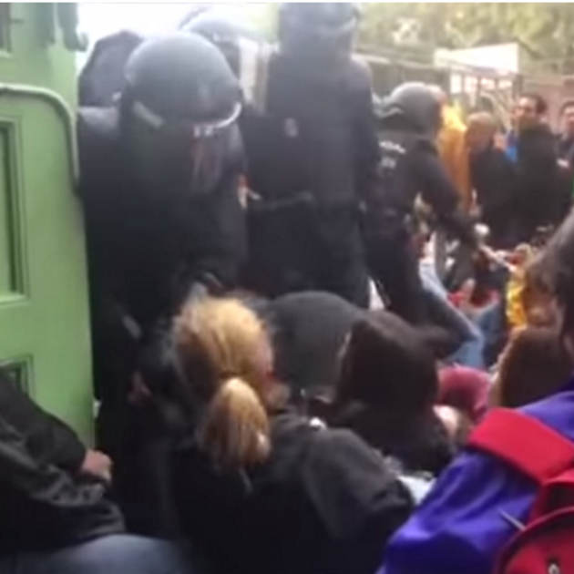 The images show the aggression by Spanish police against hundred of people with their hands in the air and shouting "som gent de pau" (we're people of peace), attempting to protect the ballot boxes.
